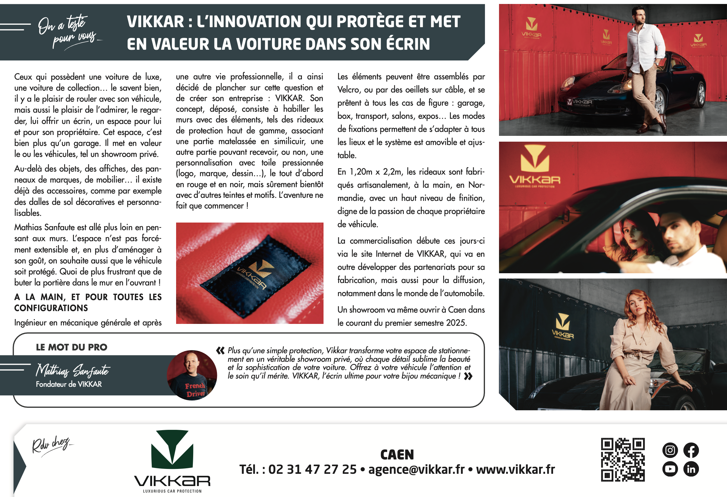 Depuis sa création, VIKKAR s’est imposé comme une référence dans l’univers de la protection automobile haut de gamme. Nos solutions allient design, technicité et exigence, et ne passent pas inaperçues auprès des médias spécialisés comme des prescripteurs du monde de l’automobile de prestige, de l’architecture intérieure et du lifestyle.